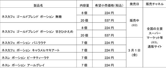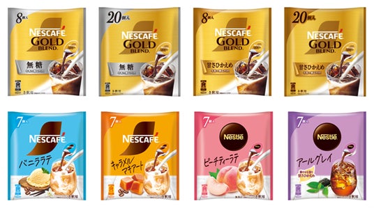 写真(左上から):「ネスカフェ ゴールドブレンド ポーション 無糖 8個」、「同 20個」、「ネスカフェ ゴールドブレンド ポーション 甘さひかえめ 8個」、「同 20個」、「ネスカフェ ポーション バニララテ 7個」、「ネスカフェ ポーション キャラメルマキアート 7個」、「ネスレ ポーション ピーチティーラテ 7個」、「ネスレ ポーション アールグレイ 7個」