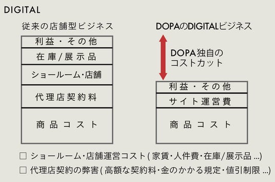 DOPAは<DIGITAL>を使った最大限の効率化と、国境を超えた<DIRECT>インポートビジネスを選択したことで、従来型ビジネスでは不可能だった圧倒的なコスト圧縮を実現し、商品を“適正な価格”でご提案しております。<DIGITAL>