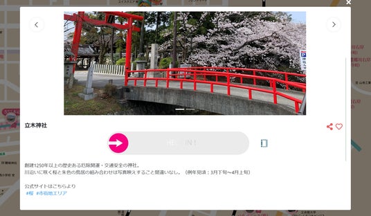 ユーザーはスマートフォンでスポットを示すピンをタップすると、桜の見ごろやスイーツ店の推しメニューなど詳細な情報を写真と共に知ることができます。