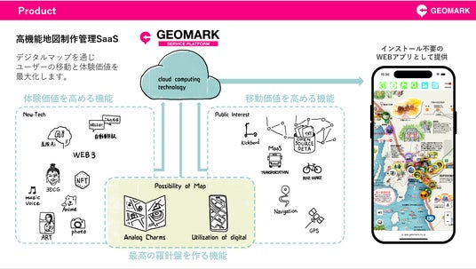 ジオ・マーク株式会社は、デジタルマップ制作管理クラウドサービス『GEOMARK』を自社開発し事業を開始。イラストマップを活用した、分かりやすく、魅力が伝わりやすいデジタルマップは複数の自治体や観光協会で利用され、地域の魅力発信に加え、観光窓口の対応負荷の削減、紙で提供していたエリアガイドのペーパレス貢献など、さまざまな効果を上げています。また、デジタルイラストマップを見ながら、エリア周遊を楽しみ、いった先でのみNFTが購入できる、マップ型NFT販売機能『CONNECT QUEST』を提供しています。