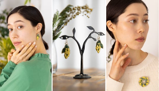 ●左・中央)手刺繍ピアス ミモザ 税込1,980円 右)手刺繍ブローチ ミモザ 税込1,980円