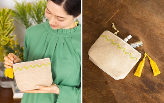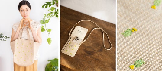 ●左)手刺繍バッグ ミモザ 税込7,920円 中央)手刺繍サコッシュ ミモザ 税込4,620円 右)刺繍アップ