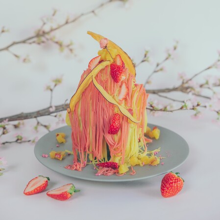 人気の蜜芋モンブランパフェを桜仕様にアレンジ。ベースにはヘーゼルナッツのメレング、ジョコンド、安納芋クリーム、クランブルを。アクセントには、カシスのクリーム&ソースで酸味をきかせています。仕上げに国産の桜を練り込んだ蜜芋クリームをたっぷりかけ、苺をふんだんに飾り付けました。蜜芋の甘さとフルーツの酸味のバランスが絶妙な、桜シーズンを彩る見た目も華やかな蜜芋スイーツです。