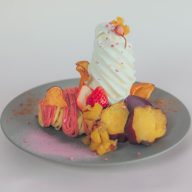 完全無添加で濃厚な味わい、昔ながらの工程で作られるAOC認証を受けたポワトゥ=シャラント(フランス)産のバターが練り込まれたこだわりのクロワッサンを使用したクロッフルに、育てる環境から焼き芋にするまでこだわって作られたアンドオイモトウキョウおすすめの焼き芋3種類の食べ比べを楽しんでいただけるプレートです。さつまいもの甘さを引き立てるさっぱりとした特製ミルクソフトクリームに、国産の桜を練り込んだ蜜芋クリームや桜クランチを添えることで春を表現しました。