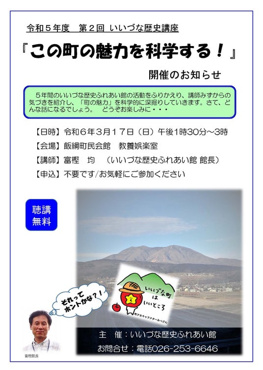 5年間のいいづな歴史ふれあい館の活動をふりかえり、講師みずからの気づきを紹介し、「町の魅力」を科学的に深掘りしていきます。さて、どんな話になるでしょう。どうぞお楽しみに・・・