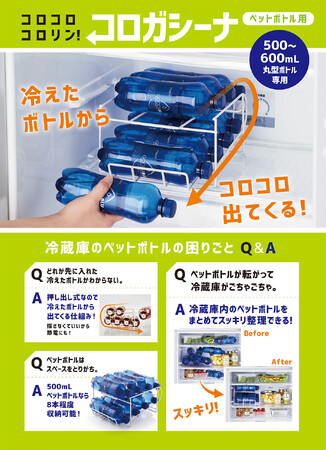 冷蔵庫内のゴチャゴチャもスッキリ収納して省スペースに!冷蔵庫の棚調節不要な高さ設計!便利なのは収納だけでなく押し出し式だから手前から取り出すだけで冷えたペットボトルから飲める!