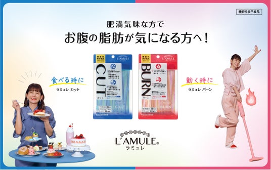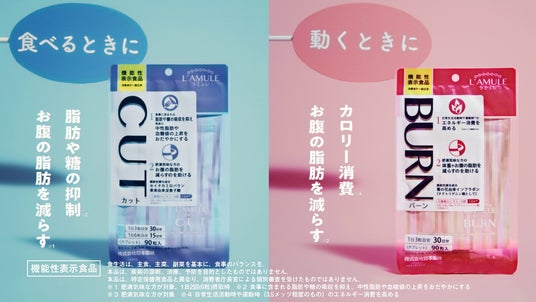 「L’AMULE(ラミュレ)」は、ライフスタイルに合わせて、人々の前向きな生活をサポートするウェルネスサプリメントブランドです。確かな機能をもつ機能性表示食品で、お腹の脂肪を減らす※1機能と、脂肪や糖を抑制※2する機能がある「L’AMULE CUT(ラミュレ カット)」と、お腹の脂肪を減らす※3機能と、カロリー消費※4機能がある「L’AMULE BURN(ラミュレ バーン)」を展開しています。