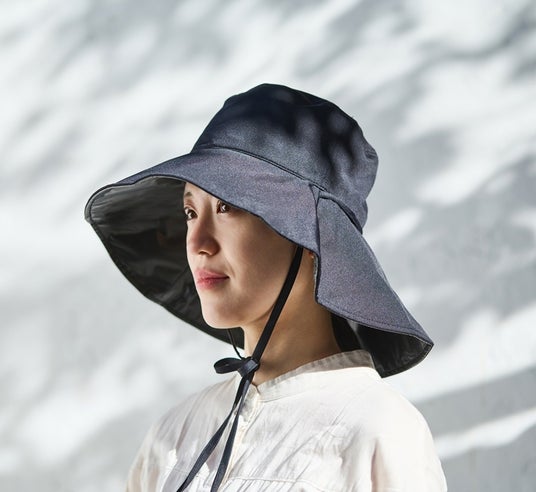 ・傘屋がつくった“かぶる日傘”です。つば部分のUVカット率・遮光率は100%で、頭まわりのサイズ調整や取り外し可能な顎紐など機能も充実しています。接触冷感&速乾機能を備えたつば広ハットです。