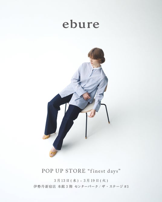 “さらに人生を楽しむという気持ちを掻き立てる服”をコンセプトに、2016年に誕生した〈ebure(エブール)〉。この度、3月13日(水)~3月19日(火)までの期間中、伊勢丹新宿店 本館3階 センターパーク/ザ・ステージ#3にて、「finest days -上質な日常-」をテーマに、“拘りの素材から生まれる質の良い日常着”にフォーカスしたPOP UPを開催いたします。伊勢丹新宿店限定カラーのデニムやジャカードブラウス、名古屋の人気フラワーショップ〈Flower Noritake〉のロスフラワーを使用したボタニカルダイTシャツの先行発売など、特別なアイテムを多数ラインナップ。