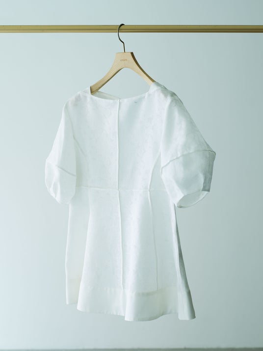 ボリュームスリーブが華やかなペプラムブラウスは、デニムとのスタイリングが楽しめるホワイトを新宿店限定発売。ボートネックの襟元が鮮度のある印象に。インポート素材でレースのような高級感の漂うコットンリネンのカラミジャカード素材を使用。切り替え部分はシルクコットンを使用していて質感の違いもデザインのポイントに。