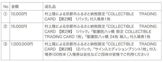 京都市京セラ美術館で開催中の個展「村上隆 もののけ 京都」開催と京都市美術館開館90周年を記念し、限定の「COLLECTIBLE TRADING CARD」付のふるさと納税のプランを2023年12月7日にリリースいたしました。