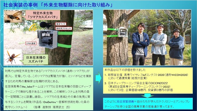 次の図は特定外来生物のハチを羽音で追跡し、巣の発見に役立つシステムを開発した高専チームの紹介で、数々のコンテストで優秀な成績を治めた事例です。