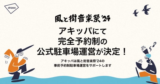 駐車場予約アプリ「akippa(以下、アキッパ)」を運営するakippa株式会社(代表取締役社長 CEO:金谷元気)は2024年4月13日(土)および14日(日)に開催される「風と街音楽祭’24」にて完全予約制の公式駐車場を運営することが決定しました。3月5日(火)10時より駐車券の販売を開始します。