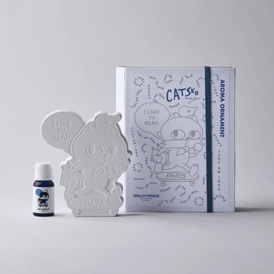 「CATSK8 AROMA ORNAMENT」は、パリのcoletteでも人気を博した香港をベースとして活動中のForlee Beanのアートを立体にし、純白の石膏で表現しました。パッケージは今回のイベントのテーマである本にコンセプトをあわせたブック型、香りは図書館の香りをイメージして調香されたBALLONのオリジナルフレグランス「 BIBLIOTHÈQUE」がセットになったスペシャルなセットです。
