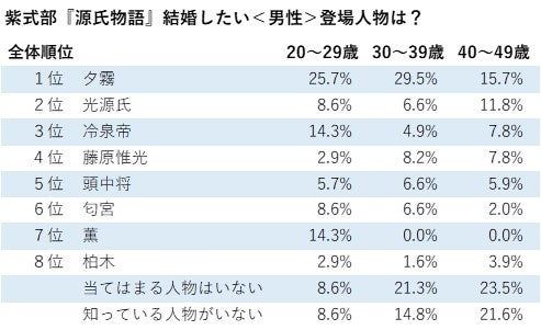 男性の登場人物は、女性の全年代で「夕霧」がトップとなりました。光源氏と正妻・葵の上の息子である夕霧は、父の意向で低い官位からスタートしたものの、自身の努力で出世した真面目なタイプ。幼なじみと結婚するなど、恋愛面も誠実で、特に30代は29.5%と人気を集めました。また30代は、2位に光源氏の乳兄弟で忠臣の「藤原惟光」(8.2%)がランクインしており、華やかな容姿や経歴よりも堅実・誠実なタイプが好まれていました。