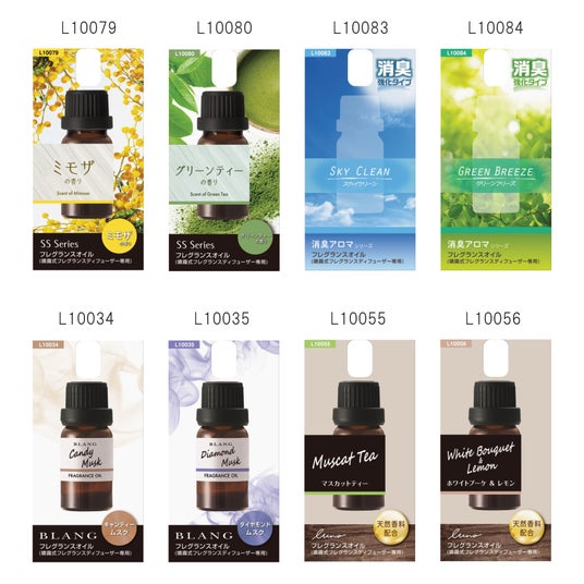 オイルと相性が良い消臭剤※を初採用。当社従来品よりも消臭性能を高めたフレグランスオイルです。香りは清潔感を意識し、すっきりとした甘さのある「スカイクリーン」とより爽快感が欲しい方におすすめな「グリーンブリーズ」の2種類を展開。