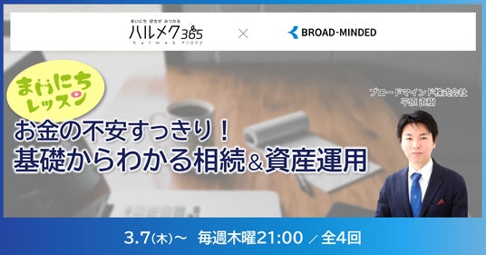 保険・証券・住宅ローンと複数の金融商品を横断して1社で取り扱い、人々のライフプラン実現をサポートするブロードマインド株式会社(本社:東京都渋谷区、代表取締役社長:伊藤清、証券コード:7343、以下「ブロードマインド」)は、株式会社ハルメク(本社:東京都新宿区、代表取締役社長:宮澤 孝夫、以下「ハルメク」)が提供するコンテンツサイト「ハルメク365」の動画企画「まいにちレッスン」にて、『お金の不安すっきり!基礎からわかる相続&資産運用』を3月7日(木)から毎週、全4回にわたり配信いたします。