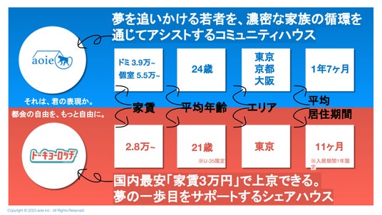 歴代23物件を展開し500名を超える若者を輩出してきた「コミュニティハウスアオイエ」を運営する株式会社アオイエ(本社:東京都江東区、代表取締役:巴山雄太、以下 アオイエ)は、このたび3万円から住める格安シェアハウス「トーキョーロッヂ」を立ち上げ、2024年3月1日から、千川、中板橋、朝霞台の3物件を始動いたしました。