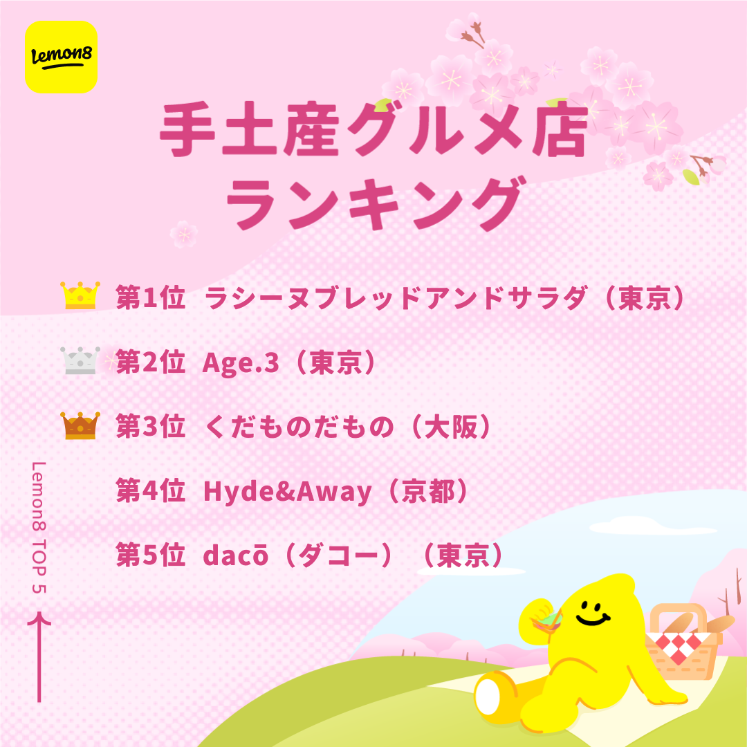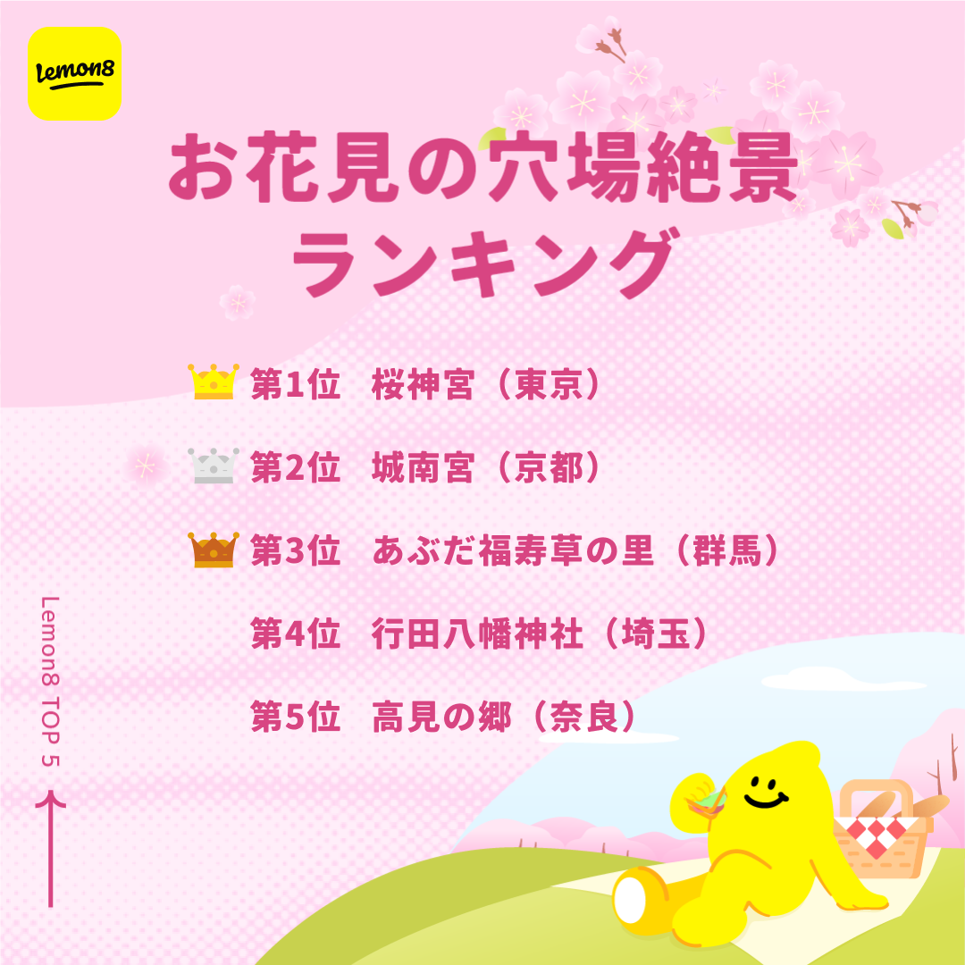 ライフスタイル共有アプリ「 Lemon8(レモンエイト)」は、Lemon8内で投稿された約12万の投稿の分析結果を元に、いち早く春を体感できる「お花見穴場絶景」や、お花見のお供に持って行きたい「手土産グルメ」という2つのテーマを選出、各ランキングTOP5を発表します。また、お花見ピクニックにおすすめの春色レシピも紹介します。