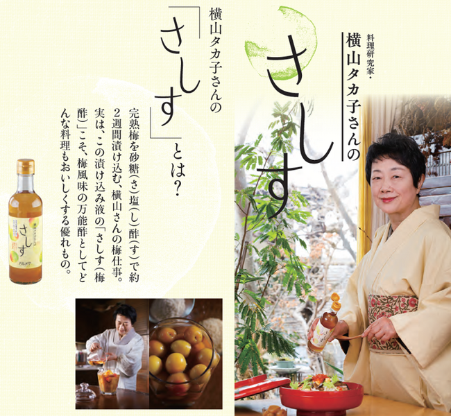 約2年前から、販売者のハルメク、製造者の杉田与治兵衛商店さんと二人三脚で私のレシピに忠実に試作を重ね、「これならば」という味にたどり着きました。「さしす」さえあれば、失敗なし。完熟梅の風味と香りも閉じ込めたまろやかな味わいで、毎日の料理がおいしくなりますよ!