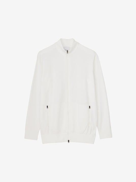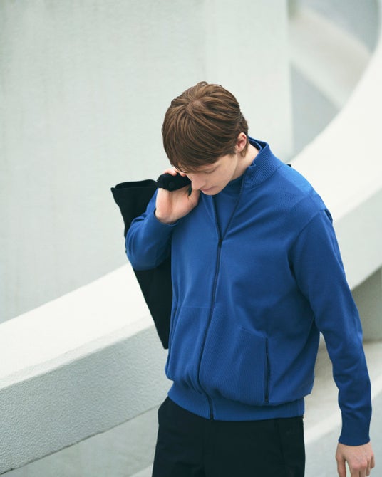 ニットブルゾンとモックネックシャツを着用。ブルーグレー(25)■フレキシブライト ニットブルゾン(ユニセックス)