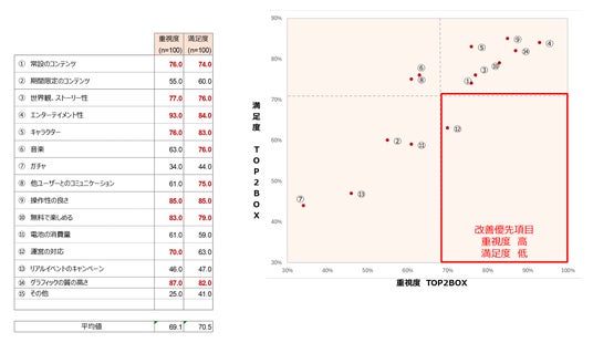 – 優先改善項目(重視度が高く、満足度が低い項目)、日本は電池の消費量、アメリカは特になし、中国は運営の対応