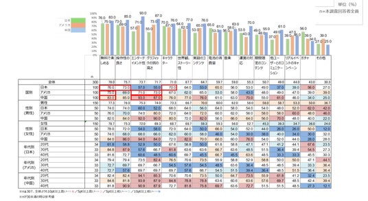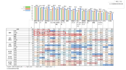 アメリカは、「無料」がトップで、「エンターテイメント性」、「操作性の良さ」、「世界観・ストーリー性」、「グラフィックの質の高さ」が7割以上。中国は「操作性の良さ」、「エンターテイメント性」、「キャラクター」、 「グラフィックの質の高さ」が8割以上で、満足度が総じて高かった。