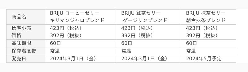 サクラ食品工業株式会社(本社:大阪府吹田市、代表取締役社長:藤原 拓)は、ゼリー商品3品『BRIJU コーヒーゼリー キリマンジャロブレンド』『BRIJU 紅茶ゼリー ダージリンブレンド』『BRIJU 抹茶ゼリー 朝宮抹茶ブレンド』を、キラリと輝く贅沢な味わいの大人のゼリー『BRIJU』シリーズとしてリニューアル発売します。