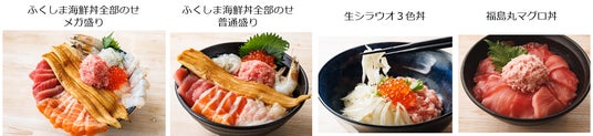 「発見!ふくしまお魚まつり」の一番人気メニューが、「常磐もの」と呼ばれる福島の魚介を贅沢に盛った「ふくしま海鮮丼全部のせ」です。今回は、「常磐もの」の代表格のヒラメ、脂ののったアナゴ、阿武隈川の清流で育てられたメイプルサーモン、葛尾村で陸上養殖された生エビ、浪江町の請戸漁港に水揚げされたこの時期にしか味わえない生シラウオ、小名浜海星高校の生徒が練習船「福島丸」で漁獲したマグロの切り落としとネギトロに、イクラも添えて、過去最多の8種をてんこ盛りにしました。普通盛りとネタが2倍のメガ盛り、お好みの魚介を味わえる「生シラウオ3色丼」「福島丸マグロ丼」もご用意しました。