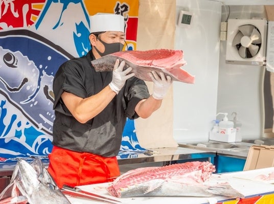 紀州・和歌山のマグロ専門店「和歌山 黒潮市場」が出店。生マグロの水揚量日本一を誇る勝浦漁港で、マグロを知り尽くしたプロが水揚げされたばかりの生本マグロの中から、脂がのったものを厳選して調達し会場に直送。来場者の目の前で解体し、さばきたての超新鮮な海鮮丼やお寿司を提供します。お薦めは大トロ、中トロ、赤身が食べ比べられる「贅沢生マグロ3種丼」。さばきたてのマグロの味わいは格別です。