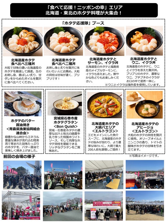 「発見!ふくしまお魚まつり」と連携し、北海道・東北のホタテ料理を集めた「食べて応援!ニッポンの幸」エリアを設けます。中国が日本の水産物を輸入停止とした影響が広がるなか、日本を代表する豊かな漁場である北海道・東北の海の幸のおいしさを発信し、国内消費を盛り上げていきます。