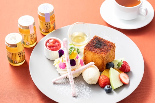 そして今回のフレンチトーストの醍醐味は、一つのフレンチトーストで様々な味わいが楽しめる4種類のトッピング。苺のソース、バニラアイスクリーム、ホイップクリームに加え、注目は季節により様々な花が咲く東京都多摩の豊かな自然で丁寧に収穫された風味豊かな「東京多摩のはちみつ」を、2か月ごとに味わいを変えてお楽しみいただきます。