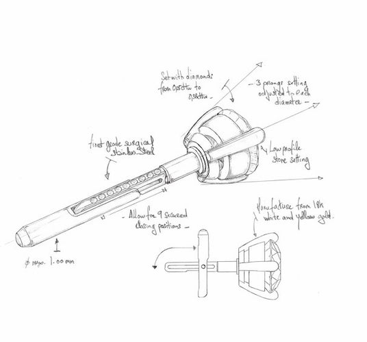 その後も改良を重ねますが、一点一点すべてハンドメイドで製作していたため、ひとつの試作品の完成までに大変な労力と時間が必要でした。例え商品化できても、量産ができないと行き詰まったバリエール氏はスイスの老舗腕時計ムーブメントファクトリー・RONDA社に掛け合います。200もの極小パーツを作って精巧な機械を組み立てることができる同社なら、彼が思い描く複雑な構造のピアスを作れるのではないかと考えたのです。