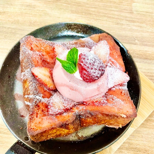 焼きたてふわとろ苺プリントースト焼きたてふわとろ苺プリントースト (1000円)苺みるくプリン液に漬け込んだデニッシュパンに、スライス苺と苺プリンをトッピング。アルバイト発案の斬新なデザートトーストです。鉄板の上で提供することで提供時にプリンが溶け出し、食べ進めるほどにピンクカラーに変化します。