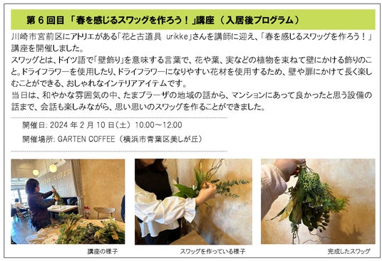 伊藤忠都市開発株式会社(本社:東京都港区、代表取締役社長:松 典男)は、分譲マンション「クレヴィアたまプラーザ」(総戸数33戸/2023年1月竣工)におけるコミュニティ形成支援活動『たまプラーザグリーンLABO』に関して、2024年2月に入居後3回目のプログラムを実施し、計画していた全6回のコミュニティプログラムが全て終了したことをお知らせいたします。