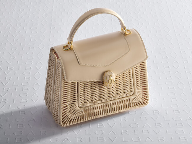 籐編みはバカンス気分あふれるこの季節のインパクトのある素材としてエフォートレスなイタリアのエレガンスをプラスし、常に進化し続けるセルペンティ コレクションにこれまでにない魅力を吹き込みます。ブルガリの芸術的なクラフツマンシップを取り入れることで高級感を出したこの天然素材は手作業で編まれており、特別に作られたメタルフレームに沿って2つの異なるパターンに編み上げています。
