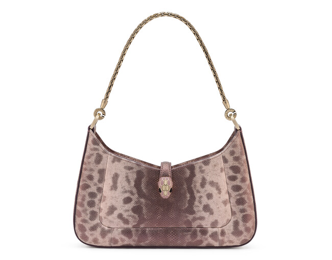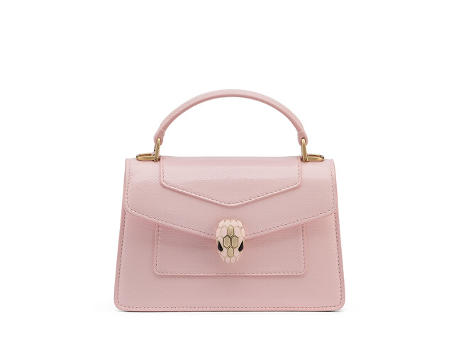 ペールピンククォーツカラーのカルングに施したつややかな仕上げが、セルペンティの新作バッグに洗練された魅力をもたらします。人気の高い宝石と同じように貴重なエキゾチックレザーを扱うブルガリは、この最も優美で魅力的な素材が持つ無限の魅力を引き出すため、さまざまな職人技を探求しています。この素材は均一でソリッドな色を実現するために天然のうろこ模様を完全に脱色し、さらに「リサージュ」と呼ばれる特殊な加工を施すことで、表面の美しい光沢を生み出しています。