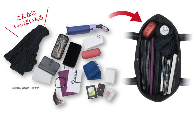 マチ幅たっぷり約12cmで、置いてもしっかりと自立します。サブバッグいらずでふくさやお財布、スマホ、折りたたみ傘などがすっぽり入ります。