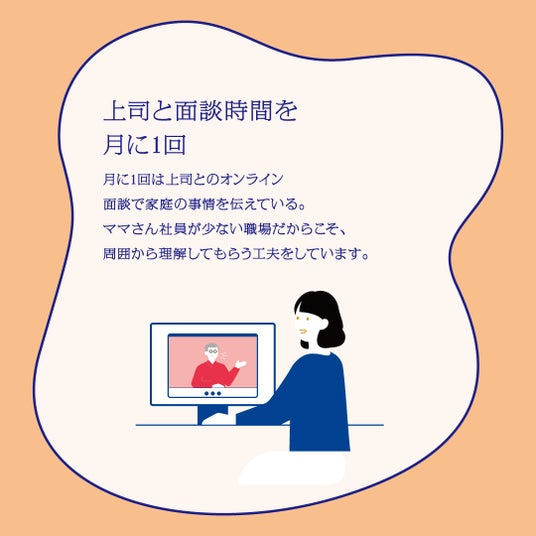 月に1回は上司とのオンライン面談で家庭の事情を伝えている。ママさん社員が少ない職場だからこそ、周囲から理解してもらう工夫をしています。(保育園年少と年長/IT会社勤務 エンジニア/週2回時短勤務/リモート)