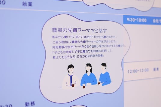 スケジュールとともに、正社員ワーママ達から集めた、多様な「仕事と子育てを両立するための工夫」も展示しています。多忙な中で、仕事の効率化や職場の同僚・上司との関わり方、将来のキャリアにつながるような取り組みに加え、家事の時短術や子どもとの時間のつくり方、息抜き方法などの日々の過ごし方の参考になる工夫も展示しています。