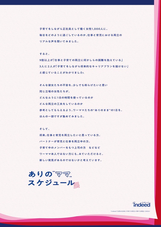 Indeedは、国際女性デーを前に1,000人の正社員ワーママを対象として「女性の仕事と子育ての両立に関する調査」(詳細は6ページ以降に記載)を実施しました。その結果、正社員ワーママの9割以上(92.2%)が「仕事と子育ての両立に何かしらの困難」を抱えており、3人に2人(66.5%)が「将来のキャリアプランの見通しを持てない」と考えていることがわかりました。本イベントは、これらの声をもとに開催することにしたもので、さまざまな立場にあるワ―ママの、ありのままのリアルなスケジュールと両立の工夫を展示することで、仕事と子育ての両立に悩む方々に、日々の過ごし方の参考にしていただくとともに、将来の見通しを立てたり今後のキャリアプランを考えたりするきっかけとしていただきたいと考えています。