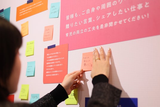 会場内には、訪れた方も自分が実践している両立の工夫やヒント、自分自身や周囲のワーママへのエールを自由に書き込めるスペースも設置しました。「力を抜いて」「完璧でなくていい」といった労いや、自分の時間を持つことの大切さを伝える声、そして、今は大変でも子どもが成長するとママの生活も変わっていく、というママ本人の経験を踏まえた励ましの言葉が集まりました。