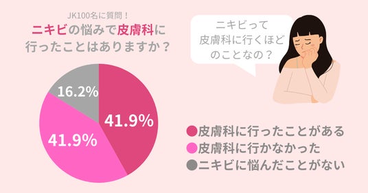 株式会社アースケアは16~18歳の女子学生100名に「ニキビの悩み」に関する調査を行いました。<調査結果>41.9%の女子高校生がニキビの悩みで皮膚科に行ったことがある
