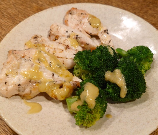 メニュー内容:焼き鳥胸肉とブロッコリー 発酵マヨユーグレナソースで
