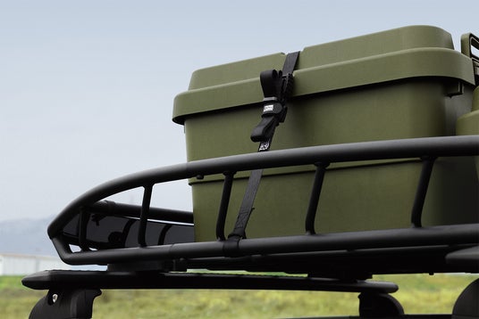 トランクカーゴシリーズは、ルーフキャリア積載コンテナとしても多くの方にご使用いただいています。トランクカーゴをもっと効率良く車載できるように、ルーフキャリア専用のベルトを開発しました。従来のベルトにはない新しい形状のベルトにする事で、荷物を固定する作業時間が短縮できます。