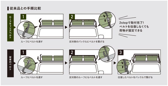 「ルーフキャリアベルト」は、「トランクカーゴ」を効率よくルーフキャリアに固定できる事が特徴です。従来の車載ベルトより簡単に取り付けができるので、時間と手間が軽減されます。