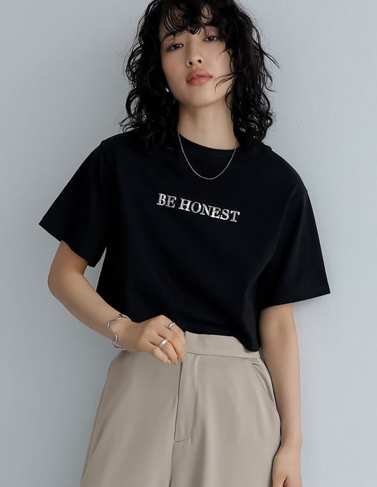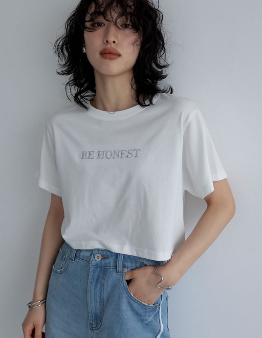 控えめながらも、刺繍されたスパンコールで立体的に仕上げたロゴが印象的な半袖カットソー。