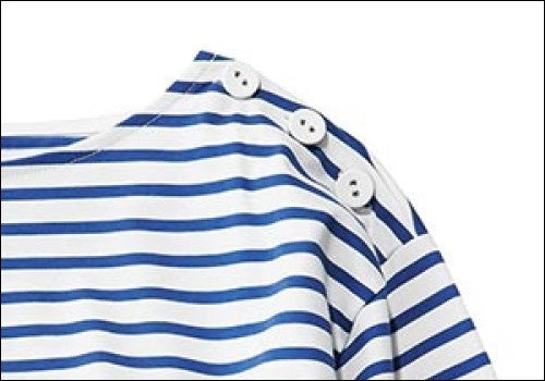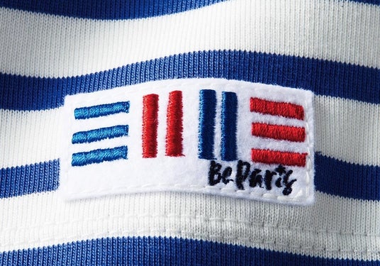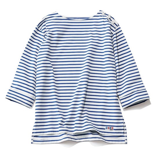 フレンチスタイルの定番・ボーダーTシャツは、強撚糸を使ったハイゲージコットンでワンクラス上の表情です。本開きの左肩ボタン、折り返しの袖口などラフでいて絵になるポイントを備えています。サイドスリットと前後差を付けた裾にはフランス国旗風のミニワッペンを付けています。