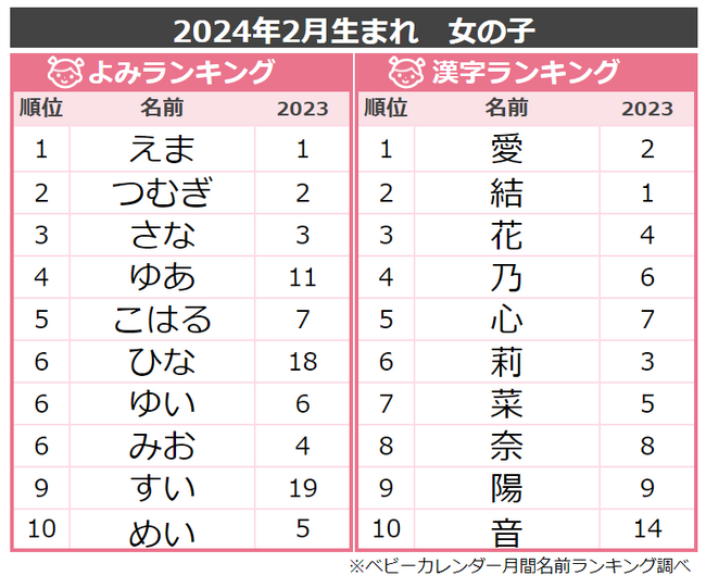 また、一足早く春を感じる漢字を使った名前も増加。2月の漢字ランキング7位「菜」、12位「咲」、16位「華」、20位「葵」など花にまつわる漢字が1月に比べ順位を上げ、上位にラインクインしています。