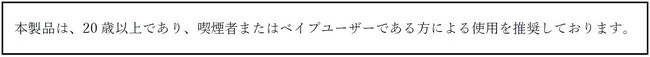 BATグループでは、たばこ製品のマーケティングを適切に実施するために国際的な自主規準を設定しています。そのためベイプ製品に関しても、弊社としては、責任あるマーケティング活動の精神に則り、本製品は20歳以上であり、喫煙者またはベイプユーザーである方による使用を推奨しております。記事掲載していただく際には、「注意文言」が表示されるようご配慮いただきたく存じます。ご協力の程、何卒よろしくお願い申し上げます。